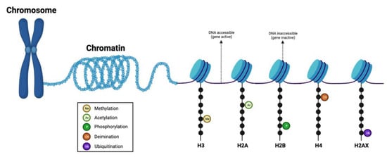 Graphical representation of the histone complex and modifications. Histone modifications determine the extent of chromatin wrapping around the histone proteins. Protruding histone tails from the nucleosome can be modified by various post-translational modifications (such as methylation, acetylation, phosphorylation, ubiquitination, and deamination) at different residues. Loosely-coiled chromatin contains transcriptionally accessible DNA regions, while tightly-coiled chromatin contains transcriptionally inaccessible DNA regions. Figure created with BioRender.com (accessed on 26 January 2023).