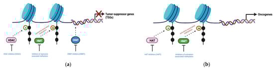 Aberrant epigenetic mechanisms in cancer and the specific application of epigenetic modifier inhibitors to reverse its effects. (a) Tumor suppressor silencing observed in cancers can be induced by DNA methylation (with DNMTs), histone deacetylation (with HDACs), or repressive histone methylation (with HMTs); (b) Oncogene activation observed in cancers can be induced by activation-associated histone hypermethylation (with HMTs) or histone hyperacetylation (with HATs). DNMT (DNA methyltransferase); HMT (Histone methyltransferase); HDAC (Histone deacetylase); HAT (Histone acetyltransferase). Figure created with BioRender.com (accessed on 30 December 2022).