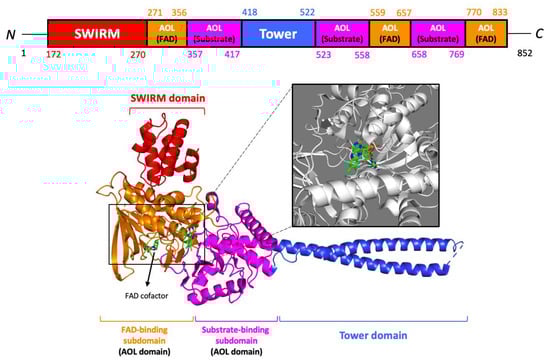The 852-residue sequence of LSD1 contains three main protein domains: the N-terminal SWIRM (Swi3p/Rsc8p/Moira) domain, a central protruding Tower domain, and a C-terminal AOL (amine oxidase-like) domain with two well-defined subdomains—the flavin adenosine dinucleotide (FAD) cofactor-binding subdomain and a substrate-binding subdomain [39,40] (Figure 4). Interestingly, LSD1 is found to be highly conserved in different organisms (both unicellular and multicellular eukaryotes), ranging from yeast Schizosaccharomyces pombe to humans [41,42]. The evolutionarily conserved SWIRM domain is found in many chromosomal proteins involved in chromatin modifications or remodeling. Recent reports on the structures of SWIRM domains were reported for mouse Ada2 (transcriptional adaptor-2), yeast Swi3 (switching deficient-3), and human LSD1 [43,44,45]. Revelations on the SWIRM domain structures, whereby the LSD1 SWIRM domain consists of a helical bundle containing a long central alpha helix that is surrounded by several shorter helix motifs, implicate a conserved SWIRM domain fold [46]. Additionally, close interactions between the SWIRM domain and amine oxidase domain through an extensive hydrophobic interface, forming a highly conserved cleft in the vicinity of the active site, may serve as an additional histone tail-binding site. The Tower domain, inserted into the AOL domain with a long helix-turn-helix structure, comprises binding spots for LSD1-interacting proteins such as CoREST (co-repressor for RE-1 silencing transcription factor), CtBP1 (carboxyl-terminal binding protein 1), HDAC1/2, and Snai1. The corepressor CoREST-binding domain is indispensable for the histone demethylase activity of LSD1, where a deletion mutant (LSD1ΔTower) replaced by a pentaglycine loop elicits an inability to reduce methylation of H3K4 [47].