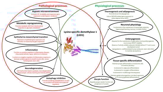 Venn diagram on the comprehensive roles of LSD1 function in both physiological (colored in green) and pathological (colored in red) conditions.