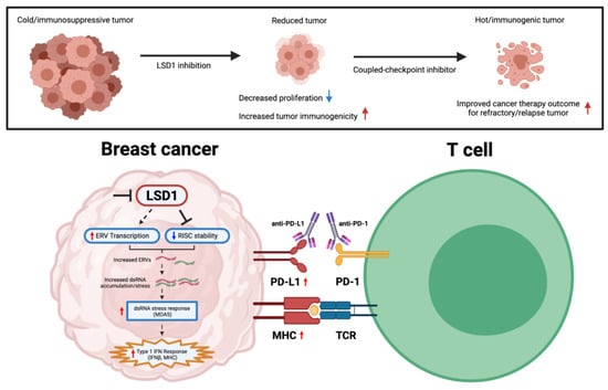 Graphical representation of mechanistic effect upon LSD1 inhibition in eliciting tumor immunogenicity in breast cancers. Red arrows indicate increased level, while blue arrows indicate reduced level. Figure created with BioRender.com (accessed on 2 January 2023).