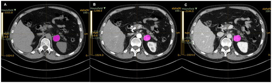 Regions of interest (ROIs, in purple) drawn with LIFEx in unenhanced (A), arterial (B), and venous (C) scans.