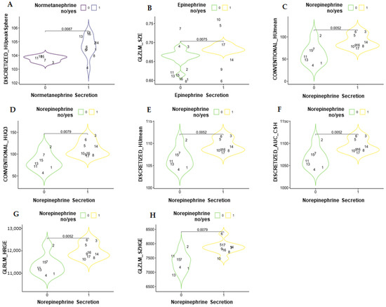 Violin plots showing the statistically significant differences in textural parameters between secreting and non-secreting pheochromocytomas in an unenhanced scan (A) and in venous scans (B–H). DISCRETIZED_HUpeak = discretized Hounsfield unit peak; GLZLM_GLNU = gray-level zone-length matrix–gray-level non-uniformity; GLZLM_SZE = gray-level zone length matrix–short-zone emphasis; CONVENTIONAL_HUmean = conventional Hounsfield unit mean; CONVENTIONAL_HUQ3 = conventional Hounsfield unit third quartile; DISCRETIZED_HUmean = discretized Hounsfield unit mean; DISCRETIZED_AUC_CSH = discretized area under the curve of the cumulative histogram; GLRLM_HGRE = gray-level run-length matrix–high gray-level run emphasis; GLZLM_SZHGE = gray-level zone length matrix–short-zone high gray-level emphasis.