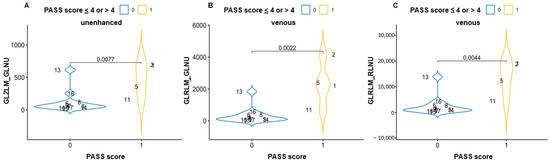 In the comparison between high and low PASS grading, GLZLM_GLNU (gray-level zone-length matrix–gray-level non-uniformity) in the unenhanced phase and GLRLM_GLNU (gray-level run-length matrix–gray-level non-uniformity) and GLRLM_RLNU (gray-level run-length matrix–run-length non-uniformity) in the venous phase showed a statistically significant difference between the groups (Figure 3 and Supplementary Table in the repository data: https://doi.org/10.25430/researchdata.cab.unipd.it.00000741, accessed on 25 December 2022). The results were calculated in all three phases (unenhanced, arterial, and venous) and are completely reported in the Supplementary Material available in repositories.
