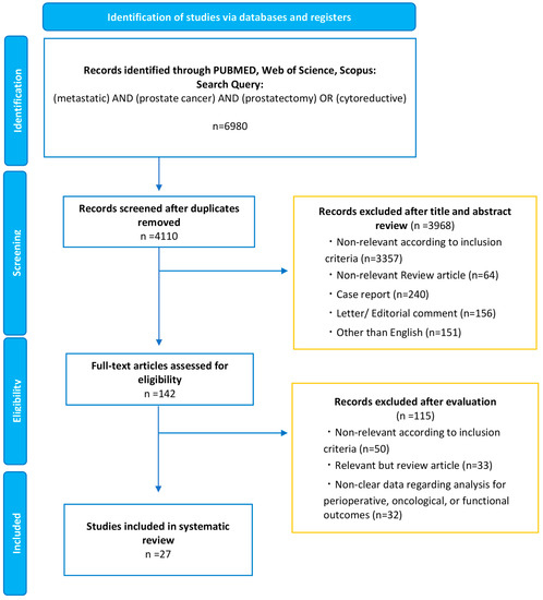 The management of metastatic hormone-sensitive prostate cancer (mHSPC) has transformed during the past decade owing to the emergence of combination systemic therapies, such as androgen receptor signaling inhibitor and/or docetaxel plus androgen deprivation therapy (ADT) [1,2,3,4,5,6]. Further, mHSPC is a heterogeneous disease entity with varied prognoses. Tumor burden stratified as low- vs. high-volume disease (defined as the presence of visceral metastases, or four or more bone metastases, of which at least one must be located outside the vertebral column or pelvic bone) on the basis of the definition of the CHAARTED trial has been shown to stratify mHSPC into different risk categories [4,6,7,8,9,10,11]. For mHSPC patients with low-volume disease, local destructive therapy for primary prostate cancer and metastasis-directed therapy have gained widespread use [12]. For example, the STAMPEDE trial showed an OS benefit by delivering radiation therapy (RT) to the prostate in mHSPC patients treated with a standard of care for low-volume disease [13]. Since then, there has been increasing interest in local therapy (LT) as a part of the treatment strategy for mHSPC to ensure durability in efficacy and quality of life (i.e., local progression prevention). In addition to RT, cytoreductive prostatectomy (cRP) has been used in this setting. A previous meta-analysis based on population-based studies demonstrated the OS benefit of cRP even in mHSPC patients, including both low- and high-volume diseases [14]. Despite this, there are several limitations in the methodology of the published literature, primarily owing to heterogeneity in the included studies and patient selection [14,15,16]. One such factor is the even-increasing heterogeneity in the low-volume mHSPC group. On the basis of the increasing implementation of prostate-specific membrane antigen (PSMA)–positron emission tomography (PET) scans in clinical practice, an increasing number of oligometastatic patients with mHSPC are being identified [17]. Therefore, we conducted this systematic and comprehensive review to update and assess the safety, oncologic, and functional outcomes in mHSPC patients who underwent cRP.