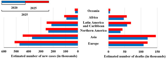 Overall, in the last 5 years, the mortality rates have declined, most probably due to improved access to treatments and dissemination of therapies, such as surgery and hormonotherapy. The projections for the next 5 years show an increasing trend in the estimated number of new cases and deaths (Figure 2), for all continents. Furthermore, in the upcoming years, the number of PCa cases may increase, because the diversion of resources to the COVID-19 pandemic has delayed diagnosis, patient management, treatment, and research. Many cancer patients had their management delayed as PCa care changed and shifted towards patterns that limited the risk of COVID-19 infection, including increased use of transperineal biopsy and hypofractionated radiation therapy regimens, as well as the substitution of docetaxel with enzalutamide [13]. This pandemic will lead to an increasing number of men diagnosed with more advanced diseases, which will have a negative impact on their prognosis. Consequently, treating patients with locally advanced or metastatic diseases is also expected to be more expensive than treating those with less advanced diseases. Therefore, to control the clinical, economical, and welfare costs to society, urgently coordinated action is needed to address the diagnostic and treatment deficiencies in PCa services [13].