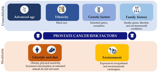 The well-established PCa risk factors are advancing age, ethnicity (Black race), certain genetic mutations, insulin-like growth factors (IGF), and family history of this malignancy (Table 1) [5]. Lifestyle, including diet, tobacco and alcohol consumption, obesity and physical inactivity, and environmental factors, such as exposure to chemicals or ionizing radiation, may also increase the risk of advanced PCa (Figure 3) [2,5,14].