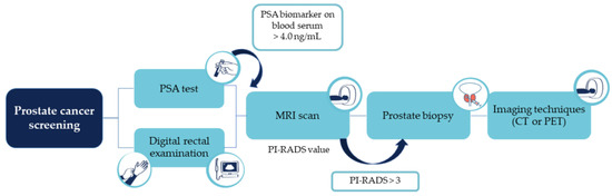 Screening for PCa is based on the PSA biomarker values in blood serum (>4.0 ng/mL) and DRE. After suspicion, a magnetic resonance imaging (MRI) scan is usually performed, which indicates whether a prostate biopsy should be performed, considering the prostate imaging–reporting and data system (PI-RADS) value (PI-RADS > 3). Following the histological confirmation (biopsy) of malignant neoplasia, staging tests are performed, through imaging techniques such as computed tomography (CT) or positron emission tomography (PET). In turn, the results of these tests dictate the patient’s therapy based on a combination of surgical strategies, hormone therapy, radiotherapy, and chemotherapy (Figure 4) [75].