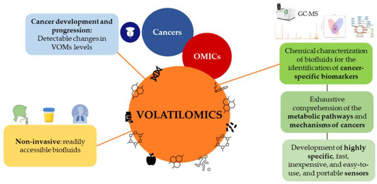 Cancer development and progression can lead to changes in the levels of volatile organic metabolites, which can be used to define a volatilomic biosignature for diagnostic purposes.