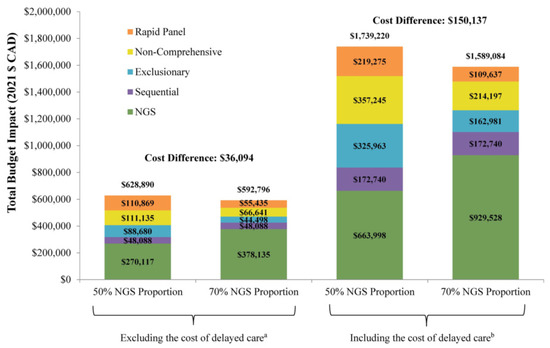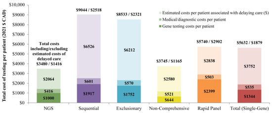 Patients receiving NGS testing had the lowest total cost of testing at CAD 3480 per patient versus CAD 5632 for all single-gene testing strategies combined, with CAD 9044 for sequential, CAD 8533 for exclusionary, CAD 3745 for non-comprehensive sequential, and CAD 5740 for rapid panel, which included the estimated costs associated with delaying care (Table 2). The cost of testing at the population level totaled CAD 663,998 for NGS relative to CAD 1,075,222 for all single-gene testing strategies combined.