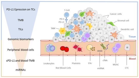 Tissue- and blood-derived biomarkers for ICIs in NSCLC. The figure shows biomarkers detectable using tissue and blood biopsies. On the left side, the biomarkers are listed in descending order, first the tissue and then the blood ones, according to the amount of evidence and robustness of the literature data. PD-L1 expression on tumor cells remains the main biomarker, currently the only one validated in clinical practice. Genomic biomarkers including MSI and other aberrations lie in the middle position because they are findable by both tissue and liquid biopsy. On the right side, the tumor microenvironment is represented. The cancer mass differs in a cold tumor and hot tumor, the latter characterized by a higher density of tumor-infiltrating lymphocytes (TILs) and other immune cells, such as tumor-associated macrophages (TAMs). Many cell populations from TME, including immune cells and circulating tumor cells (CTCs), flow into the bloodstream and can be analyzed through liquid biopsy. Promising data on biomarkers research comes from cell-free nucleic acids (cfNA), especially microRNAs (miRNA) derived from extracellular vesicles (EVs), especially exosomes.
