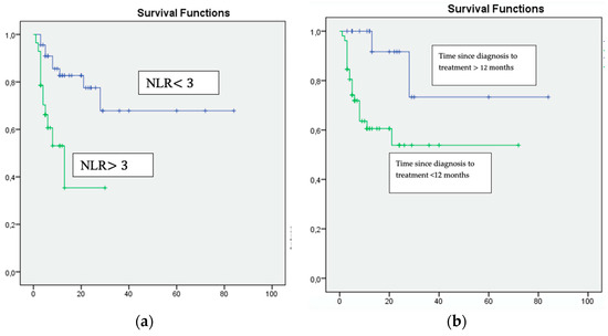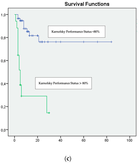 Multivariate analysis: (a) NLR ≥ 3, (b) Time since diagnosis to treatment <12 months and (c) Karnofsky Performance Status <80%, were associated with unfavourable survival.