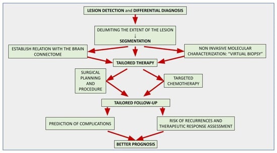 The flowchart in Figure 1 represents the developed AI tools for brain tumor imaging and their aim. The final purpose is to provide customized therapy and follow-up for each patient in order to achieve a good outcome.