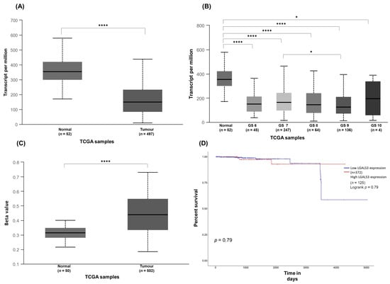 3.3. Exploration of Galectin-3 Expression in PCa and Its Impact on Patient Survival in Public Cancer Databases (In Silico Analysis)