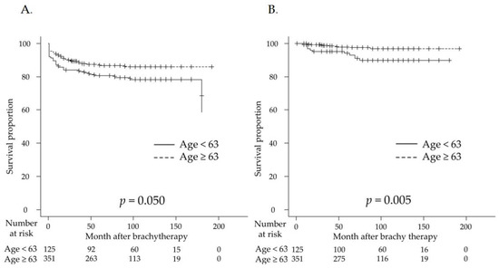 Kaplan–Meier estimates of biochemical recurrence-free survival (BRFS) in patients with prostate cancer who received low-dose-rate brachytherapy were calculated according to patient age. (A) With the RP definition, the 5-year BRFS rates were 80.6% in the group aged <63 years and 86.6% in those aged ≥63 years. The biochemical recurrence rate (BCR) tended to be higher in the population aged <63 years than in those aged ≥63 years (p = 0.050). (B) With the J-POPS definition, the 5-year BRFS rates in the groups aged <63 years and ≥63 years were 94.1% and 97.8%, respectively. The BCR rate was significantly higher in the population aged <63 years than in those aged ≥63 years (p = 0.005).