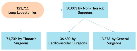 - Farjah, F.; Flum, D.R.; Varghese, T.K.; Symons, R.G.; Wood, D.E. Surgeon Specialty and Long-Term Survival after Pulmonary Resection for Lung Cancer. Ann. Thorac. Surg. 2009, 87, 995–1004, discussion 1005–1006. [Google Scholar] [CrossRef]