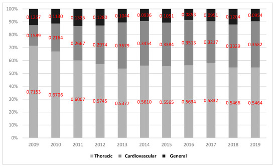 During the study period, the Premier Healthcare Database included 26,999 patients who met inclusion criteria representing an estimated population size of 121,711 lung lobectomy patients. Among them, 71,709 (58.9%) had their surgery performed by a thoracic surgeon while the remaining 50,003 (41.1%) were performed by non-thoracic providers: 36,630 (30.1%) by a cardiovascular surgeon and 13,373 (11.0%) by a general surgeon. These percentages and values are displayed in Figure 1 and Figure 2. Figure 3 represents trends in lobectomy by provider type during the study period. The proportion of lobectomies performed by thoracic surgeons decreased from 2009 to 2019 (71.5% vs. 54.6%).