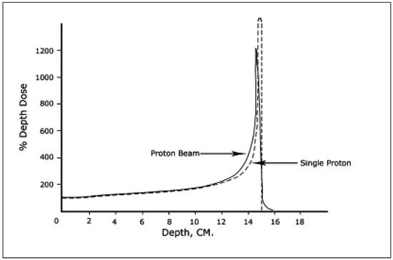 Depth dose curves for a 140 MeV proton beam versus a single proton, highlighting the “Bragg Peak” effect [].