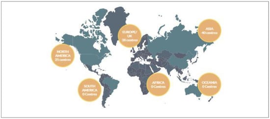 Proton therapy holds promise in addressing this limitation, due its unique physical properties. The characteristic behaviour of a proton entails the deposition of the treatment dose at a known depth with a subsequent, rapid dose-fall off. This property, termed the “Bragg peak”, has been utilized to treat a variety of precariously located tumours while sparing low doses to normal surrounding tissue (Figure 1) [,]. The enthusiasm surrounding proton therapy stems from this ability to elicit abrupt dose fall-off distal to the target of interest, thereby sparing low doses of radiation to nearby organs at risk. The therapeutic use of protons was first proposed in 1946 by Harvard physicist Robert R. Wilson []. The first patients were subsequently treated in 1954 at the Lawrence Berkeley Laboratory in Berkeley, California []. The MIT-based Harvard Cyclotron Laboratory began treating patients in 1973 with a focus on uveal melanomas, chordomas and chondrosarcomas involving the skull base and cervical spine []. These milestones paved the way for the first hospital-based clinical proton treatment centre, which opened its doors in 1990 at the Loma Linda University Medical Centre []. Since that time, the favourable outcomes seen with the use of proton therapy has led to a significant increase in uptake worldwide. According to a recent report from the Particle Therapy Cooperative Group, there are currently 121 proton facilities in operation globally, spanning 21 countries (Figure 2, Table 1). In addition to this, there are another 34 facilities under construction worldwide []. This has led to an estimated 280,000 patients that have been treated with proton therapy as of 2021 []. However, as we enter this revolutionary new era of radiotherapy, we must ensure that comprehensive clinical expertise, technical fluency and the accompanying biological considerations for particle therapy remain at pace with rapid global implementation.