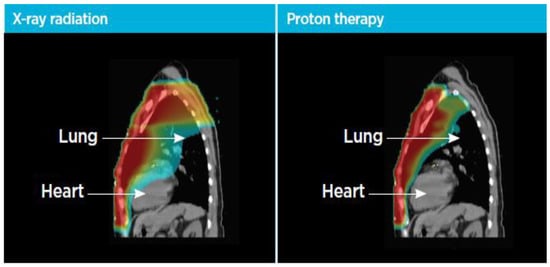 Retrospective dose modelling studies also suggest a benefit of proton therapy in optimizing lung doses with a subsequent decrease in second primary lung cancer risk. One retrospective analysis concluded that the use of proton therapy, using pencil beam scanning techniques, was associated with a lower risk of secondary lung and contralateral breast cancer risk in comparison to both conventional and IMRT/VMAT photon approaches []. In the previously mentioned phase II study of 69 patients undergoing regional nodal irradiation using proton radiotherapy, only one patient was found to develop grade 2 radiation pneumonitis. No patients developed grade 3 or 4 radiation pneumonitis []. Other reports of proton therapy for breast cancer support this finding [,].