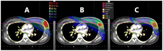 Breast cancer is the most commonly diagnosed cancer globally with over 2.3 million new cases in 2020. This number is expected to increase by 40% by 2040 []. Nearly 65% of patients diagnosed with breast cancer will be treated with radiation []. The benefit of adjuvant radiation in patients diagnosed with a breast malignancy has been shown in a number of studies. The Early Breast Cancer Trialists’ Collaborative Group meta-analysis looked at over 10,000 women in 17 clinical trials with the conclusion that radiotherapy after breast conserving surgery results in a 50% reduction in local recurrence and reduces the breast cancer death rate by about one sixth in comparison to women treated with breast conserving surgery alone []. Breast radiotherapy for early-stage breast cancer has been well-optimized in recent years to limit normal tissue injury and enhance patient quality-of-life using accelerated partial breast irradiation, deep inspiration breathhold techniques and ultrahypofractionated treatment regimens [,,].