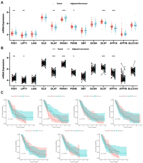 DLAT was identified as a prognostic CRG. (A) The difference in CRG expression between tumor and nontumor tissue samples: FDX1, LIPT1, DLAT, PDHA1, PDHB, DLST, and ATP7A were significantly differentially expressed; (B) the difference in CRG expression in paired tumor and adjacent nontumor tissue samples: FDX1, LIPT1, DLAT, PDHA1, PDHB, DLST, and ATP7A were significantly differentially expressed; (C) Kaplan–Meier survival curves revealed the prognostic value of FDX1, LIPT1, DLAT, PDHA1, PDHB, DLST, and ATP7A (* p value < 0.05; ** p value < 0.01; *** p value < 0.001).