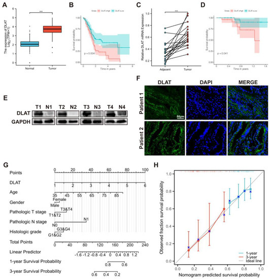 The expression and prognostic value of DLAT was validated in the TCGA cohort and the FUSCC cohort. (A) The differential expression of DLAT in tumor and nontumor tissue samples was validated by analysis of the TCGA database and the GTEx database; (B) the role of DLAT in predicting the overall survival of patients with PAAD was validated by the TCGA cohort; (C) qRT–PCR confirmed that the expression of DLAT in tumor tissues is significantly higher than that in paired adjacent nontumor tissues; (D) the role of DLAT in predicting the overall survival of patients with PAAD was validated by the FUSCC cohort; (E) Western blotting confirmed that the expression of DLAT in tumor tissues is higher than that in paired adjacent nontumor tissues (the whole western blots are shown in Figure S3); (F) tissue immunofluorescence showed the high expression of DLAT in PAAD; (G,H) DLAT–related nomogram and calibration curve for survival probability prediction (*** p value < 0.001).