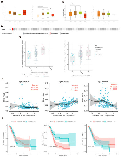 To explore the factors that influence DLAT expression in PAAD, we analyzed the potential relationship between DLAT expression and the clinical characteristics of patients. As shown in Figure 4A,B, DLAT expression was significantly different among patients grouped by tumor distinct stage and histologic grade but did not differ among patients grouped by other clinical characteristics, such as age and sex. Subsequently, we analyzed the genetic alterations of DLAT in TCGA-PAAD samples based on the cBioPortal database. One sample presented a truncating mutation, and another sample presented genetic amplification of DLAT (Figure 4C). Then, we analyzed differences in gene expression levels between different types of copy number variations (CNVs), confirming that DLAT expression is affected by CNVs and 11q arm-level copy number alterations (Figure 4D). In addition, the correlation between DLAT expression and DNA methylation was analyzed. The methylation of cg10616121, cg17213552, and cg27191019 was significantly correlated with DLAT gene expression (Figure 4E), and patients with higher methylation of cg17213552 had a worse prognosis (Figure 4F).