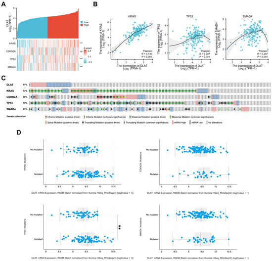 Correlations between DLAT and major driver genes in PAAD. (A,B) Correlation analysis shows that there are significant correlations between the expression of DLAT and KARS (r = 0.730), TP53 (r = 0.297), and SMAD4 (r = 0.297); (C) OncoPrint presented the mutation patterns of KARS, CDKN2A, TP53, and SMAD4 and mRNA expression of DLAT in TCGA–PAAD samples; (D) the difference in the expression of DLAT between driver gene-mutated groups and no mutation groups (** p value < 0.01; *** p value < 0.001).