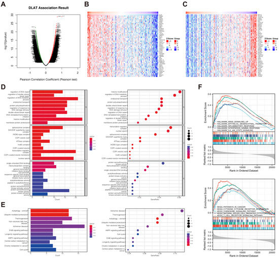 Functional enrichment analysis for investigating the potential biological function of DLAT in PAAD. (A) Genes significantly correlated with DLAT in PAAD identified with LinkedOmics; (B,C) heatmap presenting the top 50 genes positively and negatively coexpressed with DLAT; (D) the results of GO analysis based on the gene set constructed by the genes with a significant correlation with DLAT; (E) the results of KEGG pathway analysis based on the gene set constructed by the genes with a significant correlation with DLAT; (F) the results of GSEA.