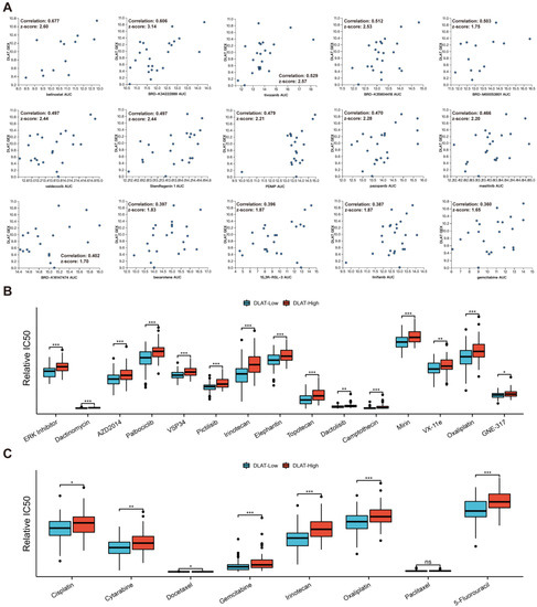 Drug sensitivity analysis revealed the effect of DLAT on therapeutic resistance. (A) The correlation between DLAT expression and the responses of PAAD cell lines to the top 15 influenced drugs; (B) the difference in the IC50s of the top 15 drugs whose sensitivity was most affected by DLAT between DLAT—high and DLAT—low PAAD samples; (C) the difference in the IC50s of the drugs commonly used for digestive system tumors between DLAT—high and DLAT—low PAAD samples (* p value < 0.05; ** p value < 0.01; *** p value < 0.001).