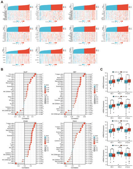 Subsequently, the correlations between DLAT and related key genes and the expression of immunomodulatory genes were analyzed (Figure 11A). Among them, DLAT, DBT, and PDHB were strongly correlated (|r| > 0.4, p < 0.05) with more immunomodulatory genes, particularly immunoinhibitors. Based on the ESTIMATE algorithm, we found that DLAT, DBT, PDHB, and PDK3 have significant effects on the ES in PAAD samples (Figure S1). Based on the above results, we defined DLAT, DBT, PDHB, and PDK3 as key immune-related genes. Using ssGSEA and the CIBERSORT algorithm, we verified the significant correlation between the key immune-related genes and the infiltration levels of TIICs (Figure 11B and Figure S2). In addition, there were significant differences in the expression of PD-1, PD-L1, and CTLA-4 among samples with high or low expression of DLAT, DBT, and PDHB, while there were no differences in samples grouped according to PDK3 expression level (Figure 11C). Finally, the GEPIA2021 database was used to analyze the expression of DLAT and related key genes in TIICs. The expression of these genes was significantly different among different TIICs in the PAAD microenvironment (Figure 12A), and also significantly different for the same type of immune cells infiltrating tumor or normal tissue (Figure 12B).