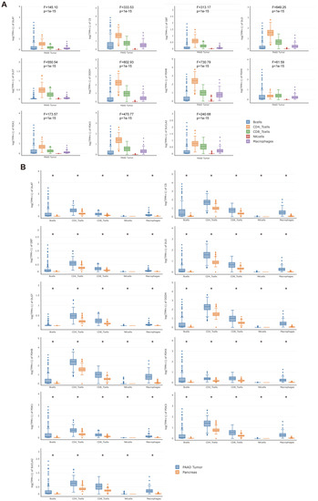 The expression of DLAT and related key genes in TIICs was analyzed based on the GEPIA2021 database. (A) Differences in the expression of DLAT and related key genes among different TIICs in the PAAD microenvironment; (B) differences in the expression of DLAT and related key genes between the same type of immune cells infiltrating tumor or normal tissue (* p value < 0.05).