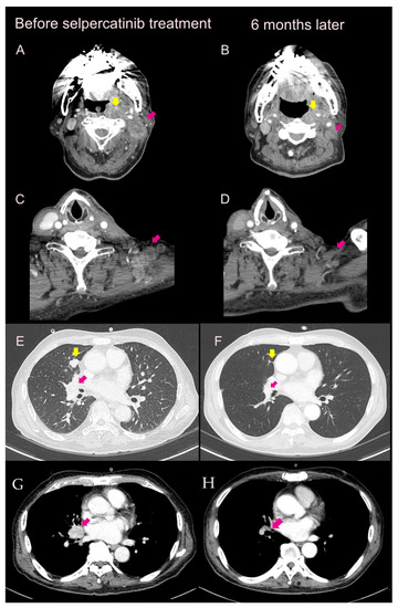 CT scan images of the Case 1 patient before and at six months after selpercatinib treatment. Before selpercatinib treatment, there were metastatic lesions at the neck (A); lateral lymph node (C); lung parenchym (E); and hilar lesion (G). All of them showed regression at six months after selpercatinib treatment (B,D,F,H) (yellow and purple arrows).