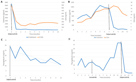 The changes of tumor markers during the selpercatinib treatment for each patient: (A) the changes of calcitonin and carcinoembryonic antigen (CEA) of the patient in Case 1; the levels were decreased (for calcitonin, from 8541 pg/mL to 52.91 pg/mL and for CEA, from 886 ng/mL to 247 ng/mL); (B) the calcitonin and CEA levels of the patient in Case 2 (for calcitonin, from 944.6 ng/mL to 12.19 ng/mL and for CEA, from 13.7 ng/mL to 9.32 ng/mL); (C) the thyroglobulin level of the patient in Case 3 (from 28.57 ng/mL to 10.96 ng/mL); (D) the thyroglobulin level of the patient in Case 4 (from 37.11 ng/mL to 0.48 ng/mL).