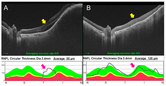 Optical coherence tomography (OCT) of left eye in Case 2 before and at one month after selpercatinib treatment; Image (A), before treatment; Image (B), after treatment; thickening of choroidal layers with irregular anterior surface is a typical feature of choroidal metastasis at OCT. It is well observed in (A) (yellow arrow) but not observed in (B). The thickness of each layer was out of normal range before treatment. It was improved after treatment (purple arrow, the black line).