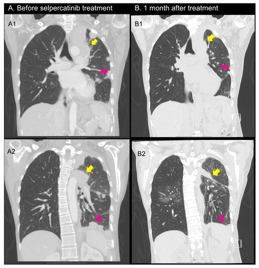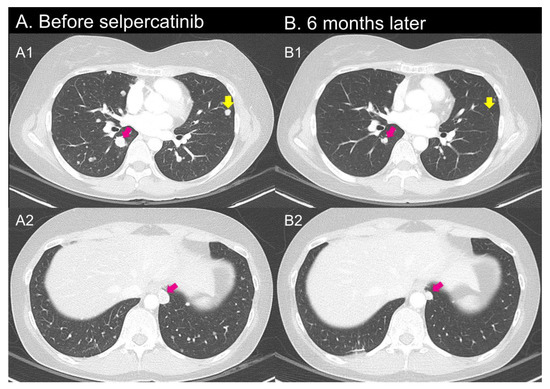 Before and at one month after selpercatinib treatment CT-scan of the patient in Case 4. Before treatment, there were metastatic lesions at hilar lesion, pleural, and lung parenchyme (A1,A2). After the treatment, all of them showed regression (B1,B2, yellow and purple arrows).