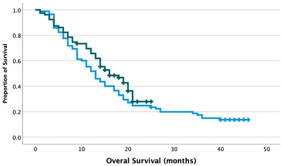 Overall survival of grade 4 glioma patients treated in the pre-COVID and COVID era. Blue line: patients treated in the pre-COVID era, median OS 13 months. Green line: patients treated in the COVID era, median OS 16 months. p = 0.189. Crosshatches represent censored outcomes.