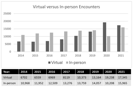 Total encounters from 2014 to 2020, separated by virtual and in-person encounters.