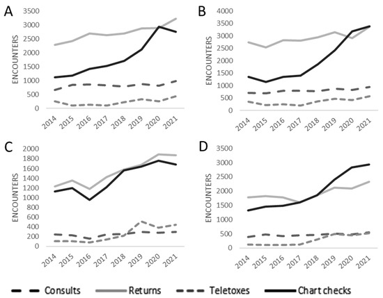 Total patient encounters by encounter type, 2014–2021.