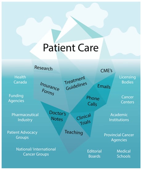 - Fundytus, A.; Hopman, W.; Hammad, N.; Biagi, J.; Sullivan, R.; Vanderpuye, V.; Seruga, B.; Lopes, G.; Sengar, M.; Brundage, M.; et al. Medical Oncology Workload in Canada: Infrastructure, Supports, and Delivery of Clinical Care. Curr. Oncol. 2018, 25, 206–212. [Google Scholar] [CrossRef] [PubMed]