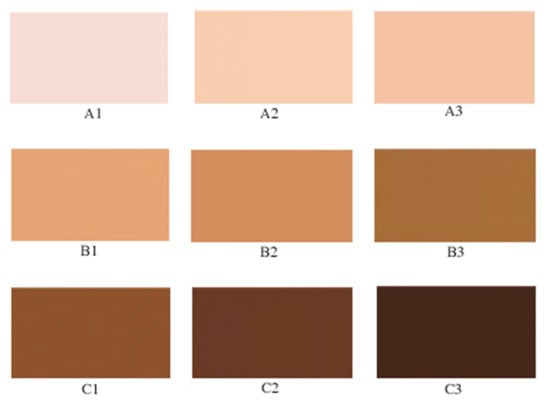 The scale was set up in a 3 × 3 pattern with rows down A, B, C and columns across 1, 2, 3, where A1 was the lightest color and C3 was the darkest (Figure 1). Participants had the ability to hold up the palette to compare to their forearm and inner arm during data collection. The final SASTP 9 skin tones were translated to melanin values of 19.4, 20.5, 25.0, 30.6, 37.6, 58.6, 72.0, 90.5, and 102.2.