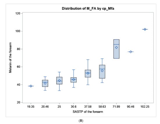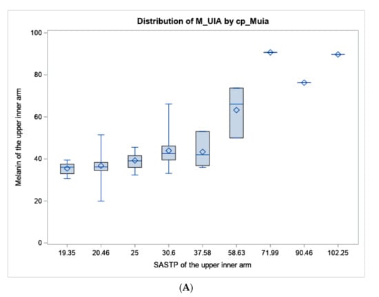 Boxplot of melanin values from the colorimeter vs. the SASTP for the (A) upper inner arm, and (B) forearm. The diamond represents the mean, the horizontal line in the box represents the median. the length of the box represents the interquartile range, the whiskers at the end of each represent the maximum and minimum values of melanin.