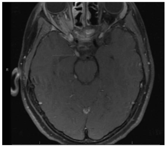 Our patient is a Hispanic female who first presented at age 2 with clumsiness and dysarthria. Her initial MRI brain/face revealed right vestibular schwannoma but no other NF2-related pathology. Genetic testing was sent from a serum blood sample to the University of Alabama and analyzed for next generation sequencing (NGS) as well as duplication/deletions using multiplex polymerase chain reaction (PCR) assay (MLPA). It revealed a specific pathogenic mutation, c.-854-??46+??deletion, which was previously identified in her father who was diagnosed with NF2. There was no biallelic loss of NF2. Shortly thereafter, she underwent removal of a forehead lesion with pathology confirming a schwannoma. At age 4, a 7-mm enhancing lesion filling the right L1-L2 neural foramen was identified and thought to be a nerve root schwannoma. At age 5, brain MRI revealed a growing right optic nerve/optic nerve sheath that appears slightly fuller in the orbital apex, with concerning meningioma (Figure 1). Since she was not a surgical candidate, she received proton beam radiation therapy to the right optic nerve meningioma and a right cranial nerve schwannoma with a total of 48.6 cGy in 27 fractions without any systemic therapy. At age 8, she was noted to have mild to moderate conductive hearing loss for the right ear, normal hearing sensitivity for the left ear and right middle ear disorder. At age 11, she was noted to have hypothyroidism and started on levothyroxine. She was also being treated for attention deficit hyperactivity disorder (ADHD), anxiety, depression and self-harming behavior.