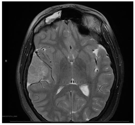 At age 12, brain MRI revealed that the intracranial meningioma and bilateral vestibular schwannomas were slightly larger. Spine MRI showed multiple thoracic and lumbar spine tumors, most significant at T4 and L2 and L4 cauda equina. There was also a possible ependymoma in the upper cervical spine, but there was no spinal cord compromise from any tumors. Surgery was again not indicated at that time. At age 13, face MRI revealed a large right frontotemporal meningioma that was considerably enlarged from the study three months prior, measuring approximately 5 × 3 × 5 cm compared to approximately 2.2 × 1 × 2.4 cm (Figure 2). There was mass effect of the surrounding brain structures, resulting in effacement of the right lateral ventricle and shift of midline by about 4 mm. She had worsening headaches and vomiting, prompting further imaging that revealed an increase in tumor size. This prompted a gross total resection via craniotomy of the right temporal meningioma. Pathology of the tumor confirmed an anaplastic meningioma of WHO grade III. Genetic testing on tumor demonstrated MLH1 loss of expression with focal positivity and retained expression of PMS2, MSH2 and MSH6. Due to the high-grade meningioma, she proceeded with radiation and completed 3600 Gy. Towards the end of the year, she returned to surgery to resect a nerve sheath tumor on the right side of the neck, with pathology confirming schwannoma.
