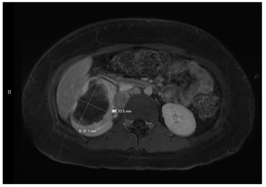 At age 15, she presented to an outside ER with a 2–3-day history of worsening right lower quadrant abdominal pain, nausea and occasional vomiting. She also had a history of a 20-lb weight loss over the past few months due to decreased appetite. CT scan showed a right renal mass 7 cm in size. She was transferred to our hospital and MRI abdomen/pelvis showed an indeterminate left adrenal nodule (Figure 3) and a large, solid, peripherally enhancing right renal mass with central heterogeneity measuring 8.1 × 5.4 × 8.7 cm (Figure 4). It also showed retroperitoneal lymphadenopathy with a retrocaval node at 4.1 × 2 cm, superior retrocaval node at 2.6 × 1.6 cm and an inferior precaval/aortocaval node at 1.5 × 0.9 cm. There was also a right lung nodule noted on a chest CT (Figure 5). She then had a baseline positive emission tomography (PET) scan which again showed the right renal mass, concerning for primary renal cell carcinoma, FDG avid retroperitoneal lymphadenopathy, concerning for metastasis and small bilateral pulmonary nodules, concerning for metastasis. She underwent a biopsy of the right renal mass, which was inconclusive. She underwent a second biopsy and was found to have RCCU-MP manifesting as a high-grade malignancy with loss of SMARCB1 by immunohistochemistry in the absence of a sickle hemoglobinopathy.