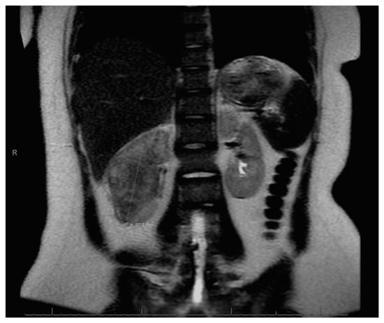She completed 2 more cycles of chemotherapy and then proceeded with a right nephrectomy and retroperitoneal lymph node sampling. Pathology was consistent with excellent treatment response and no evidence of viable tumor in either the nephrectomy or the seven resected paracaval and aortocaval lymph nodes. After surgical clearance, she resumed chemotherapy. However, carboplatin 400 mg/m2 on day 1 was substituted for cisplatin due to reduction of kidney function. Cycle 5 day 15 of chemotherapy was delayed for thrombocytopenia, and day 15 was omitted from cycle 6 again due to thrombocytopenia. Towards the end of treatment, she required prolonged antibiotic therapy for multiple infections. She was diagnosed with enteropathogenic E. coli gastroenteritis and E. coli urinary tract infection and was treated with IV cefepime. She had increased abdominal tenderness and was diagnosed with typhlitis based on CT abdomen. Antibiotics were escalated to IV meropenem. During the same hospitalization, blood cultures were positive for Candida tropicalis, and Staphylococcus epidermis. IV vancomycin and IV caspofungin were added to her treatment. She completed a course of oral linezolid and oral fluconazole to complete a course of 14 days. Her blood counts recovered, and she was able to complete a total of 6 cycles of chemotherapy, with end of therapy PET/CT negative for any FDG-avidity and no evidence of residual tumor, as well as abdomen MRI negative for disease (Figure 6).