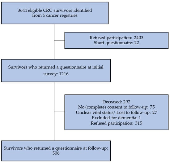 The population-based CAncEr Survivorship—A multi-Regional (CAESAR) study aimed to describe the long-term HRQOL of colorectal, breast, and prostate cancer survivors. The German Cancer Research Center (Deutsches Krebsforschungszentrum, DKFZ) conducted the study in collaboration with six epidemiologic cancer registries in Germany (Bremen, Hamburg, North Rhine-Westphalia, Rhineland-Palatinate, Schleswig-Holstein, and Saarland). This study used data from five cancer registries as no CRC survivors were recruited from Schleswig-Holstein for logistical reasons. Cancer survivors diagnosed between January 1994 and June 2004, as registered in the participating cancer registries, and aged between 20 and 75 years at diagnosis, were eligible. Details of the initial study have been described elsewhere [18]. Initial recruitment was in 2008–2010, 5–16 years post-diagnosis. Between 2018 and 2019, a follow-up assessment was conducted among survivors (14–24 years post-diagnosis) who had given consent at initial recruitment to be re-contacted and who were still alive [17]. Of the 2704 (62.9%) participants who returned a full-length questionnaire at follow-up assessment, 506 (19%) were CRC survivors. Further details about the response have been previously reported, namely that CRC survivors were less likely to participate at follow-up in contrast to breast or prostate cancer survivors [17].