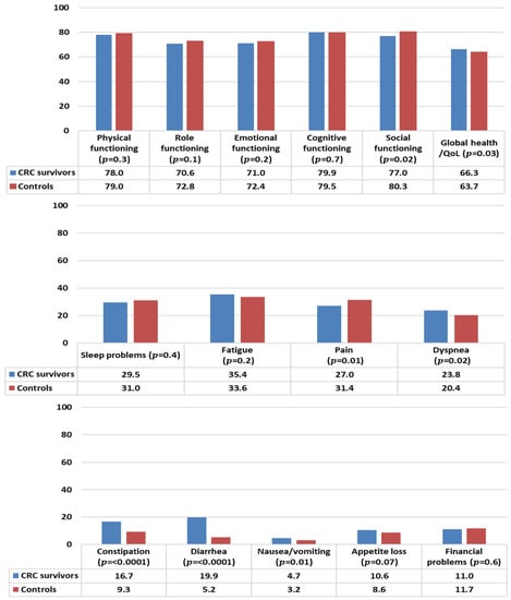 In general, CRC survivors reported levels of functioning comparable to controls, except for social functioning that was statistically significantly lower than controls (Figure 2). CRC survivors reported a better health status/QOL than controls. With respect to symptom burden, CRC survivors reported less pain but more problems with dyspnea, constipation, diarrhea, and nausea/vomiting than controls.