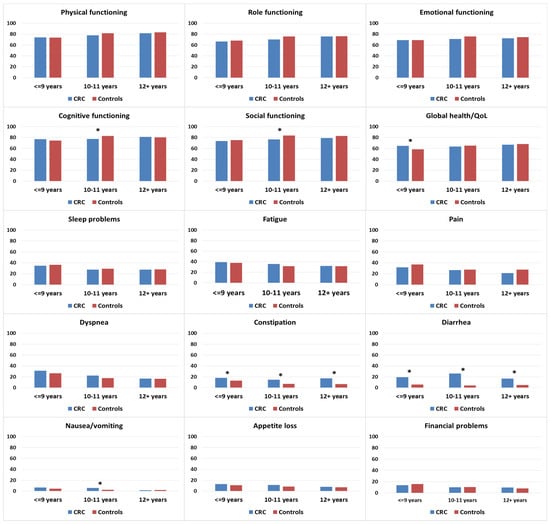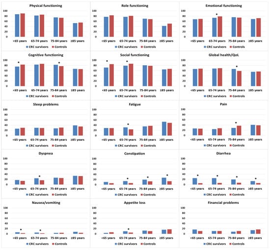 Mean EORTC QLQ-C30 scores of colorectal cancer (CRC) survivors and controls, stratified by age at survey. Models are adjusted for age at survey, sex, and education. Asterisks (*) indicate significantly differences (p < 0.05) between the subgroups. All results are based on 25 imputations of missing values.